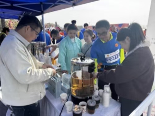 选手们在补给站品尝以沙苑子为原料的特色健康饮品